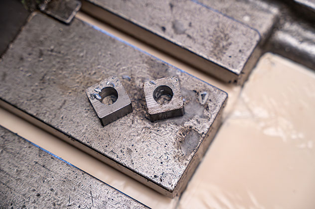 L’abrasif est projeté à grande vitesse avec une sableuse sur la surface à travers une buse spéciale. La pression du sable est minutieusement contrôlée, tout comme la distance de projection, pour obtenir une gravure uniforme et nette. Cette étape crée le marquage en creux sur la surface de manière précise, avec une finition en relief.